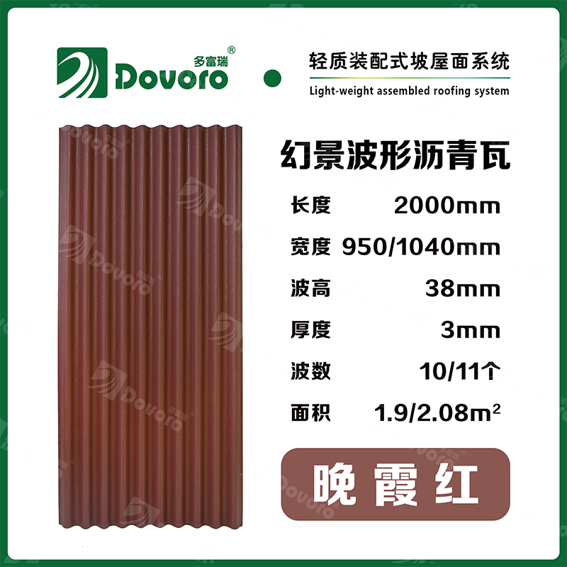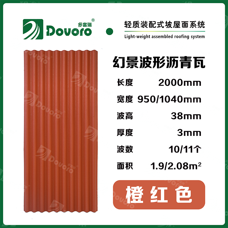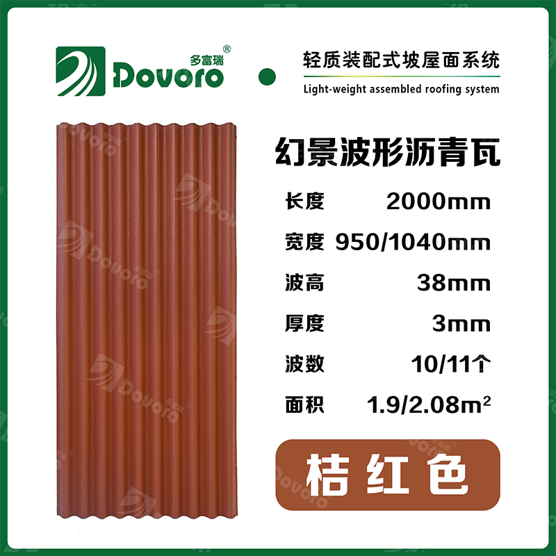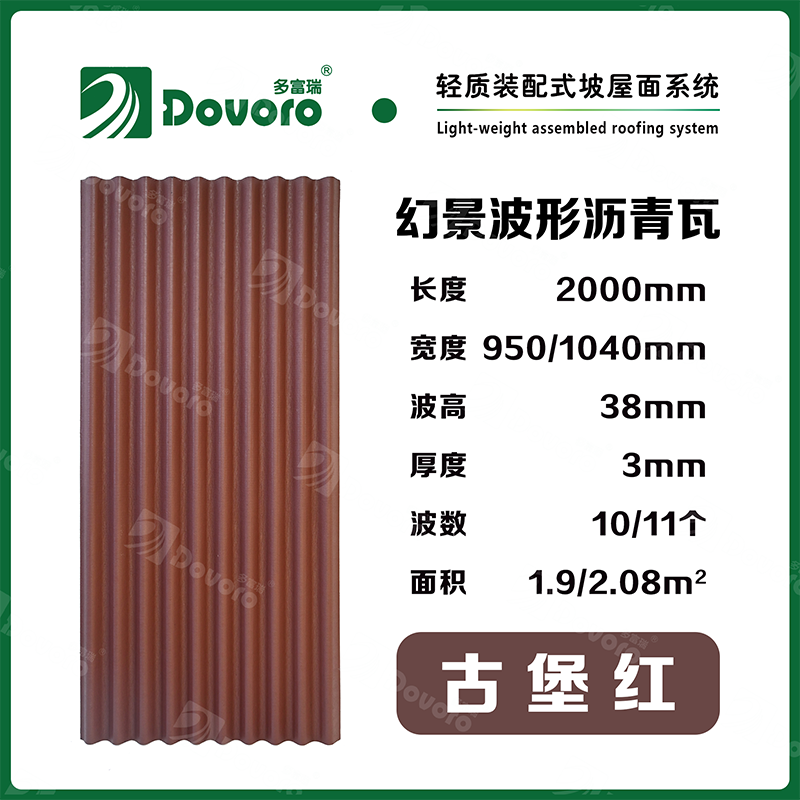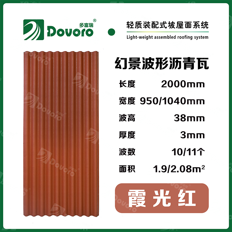 1、多富瑞幻景波形瀝青瓦由礦植物纖維在高溫高壓下浸潤瀝青而成,瓦材整體更加牢固且具有很強的韌性,熱固性樹脂為材料保持強度;
