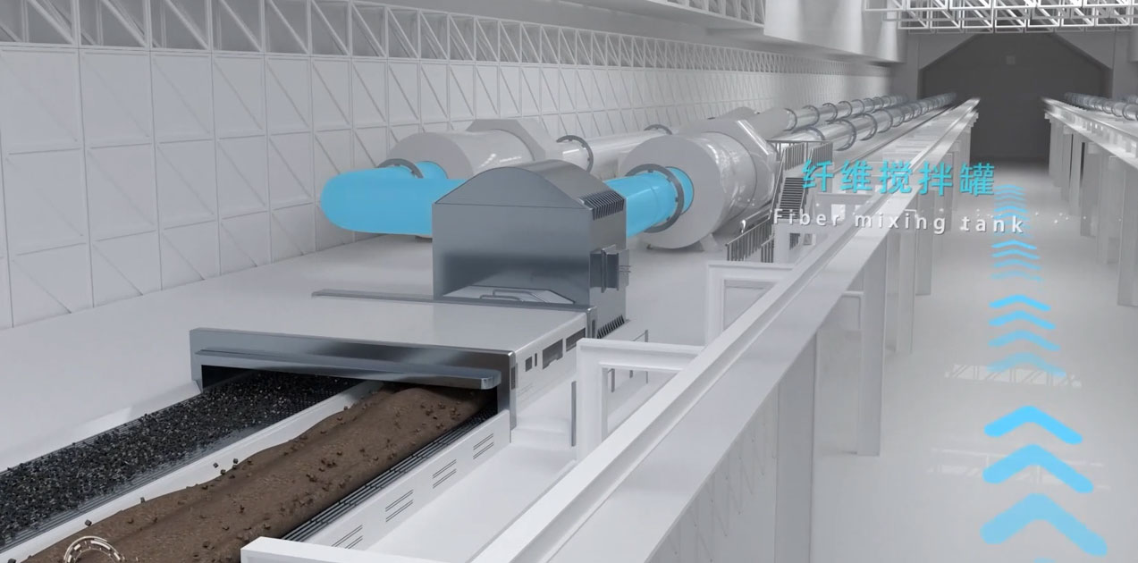 纖維攪拌罐→波紋板加工車間→紙板輥壓機(jī)→瀝青板傳送機(jī)→瀝青罐