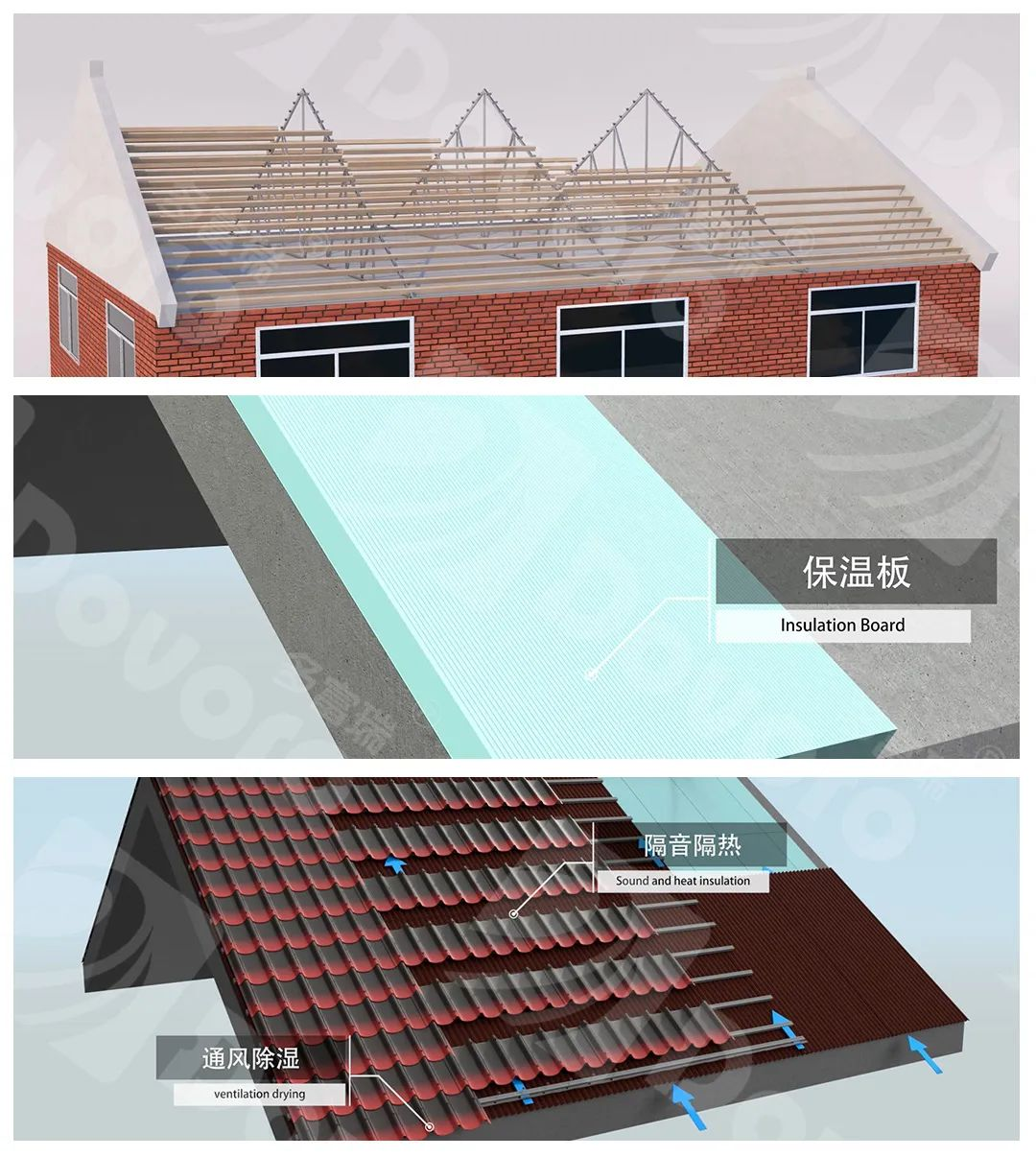 空氣是流通的,屋面的溫度就不容易傳遞到下方的空間。同時有助于降低屋面瓦的表面溫度,延長屋面使用壽命。