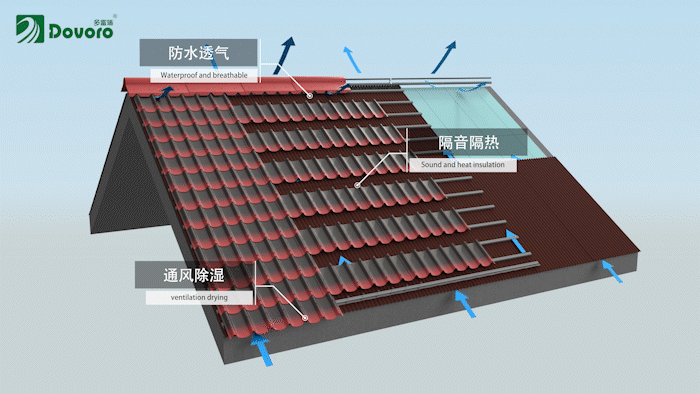 傳統(tǒng)的坡屋面系統(tǒng),也有一定排水的效果,但屋面瓦下方就是保溫板和防水卷材。