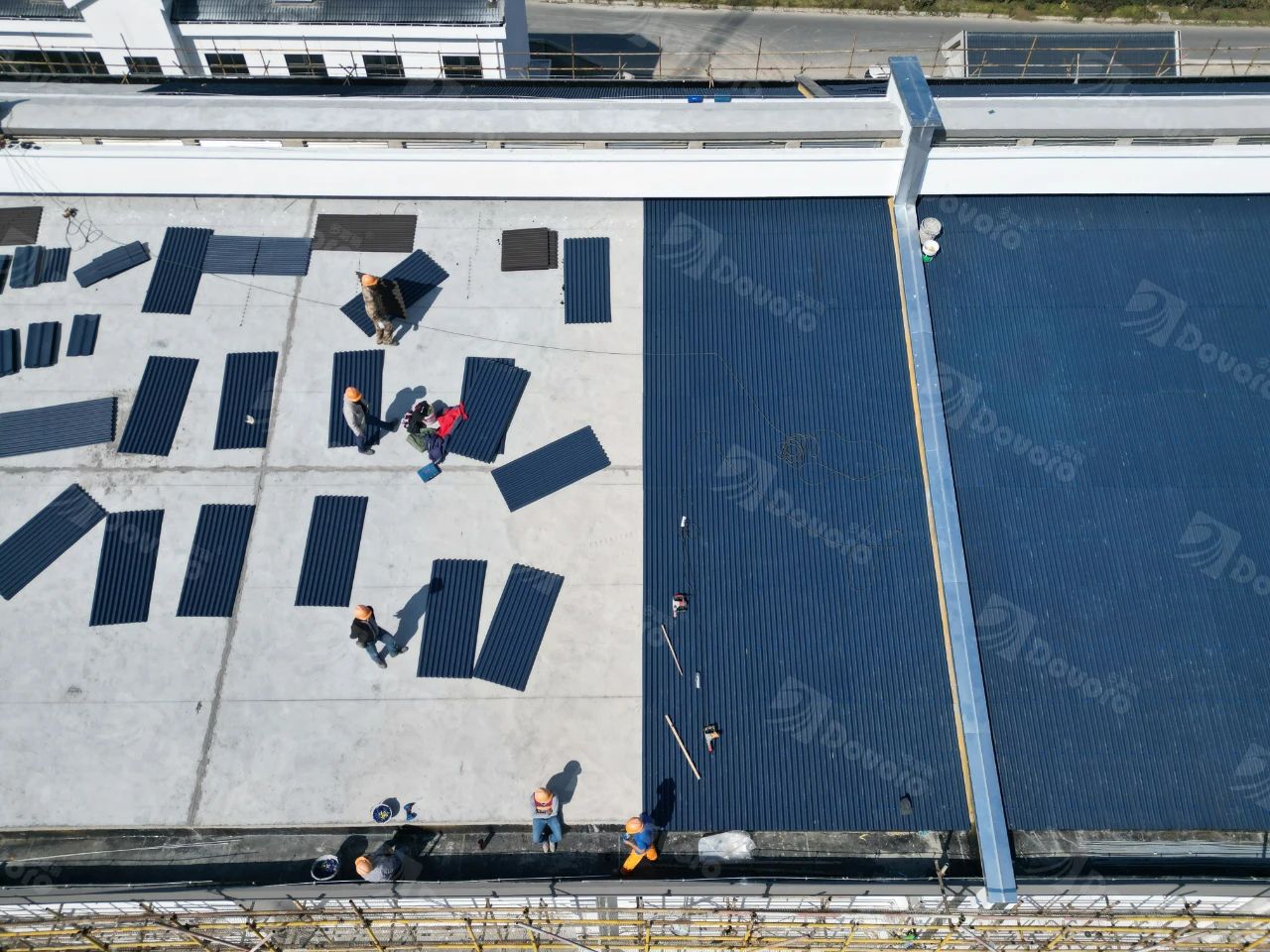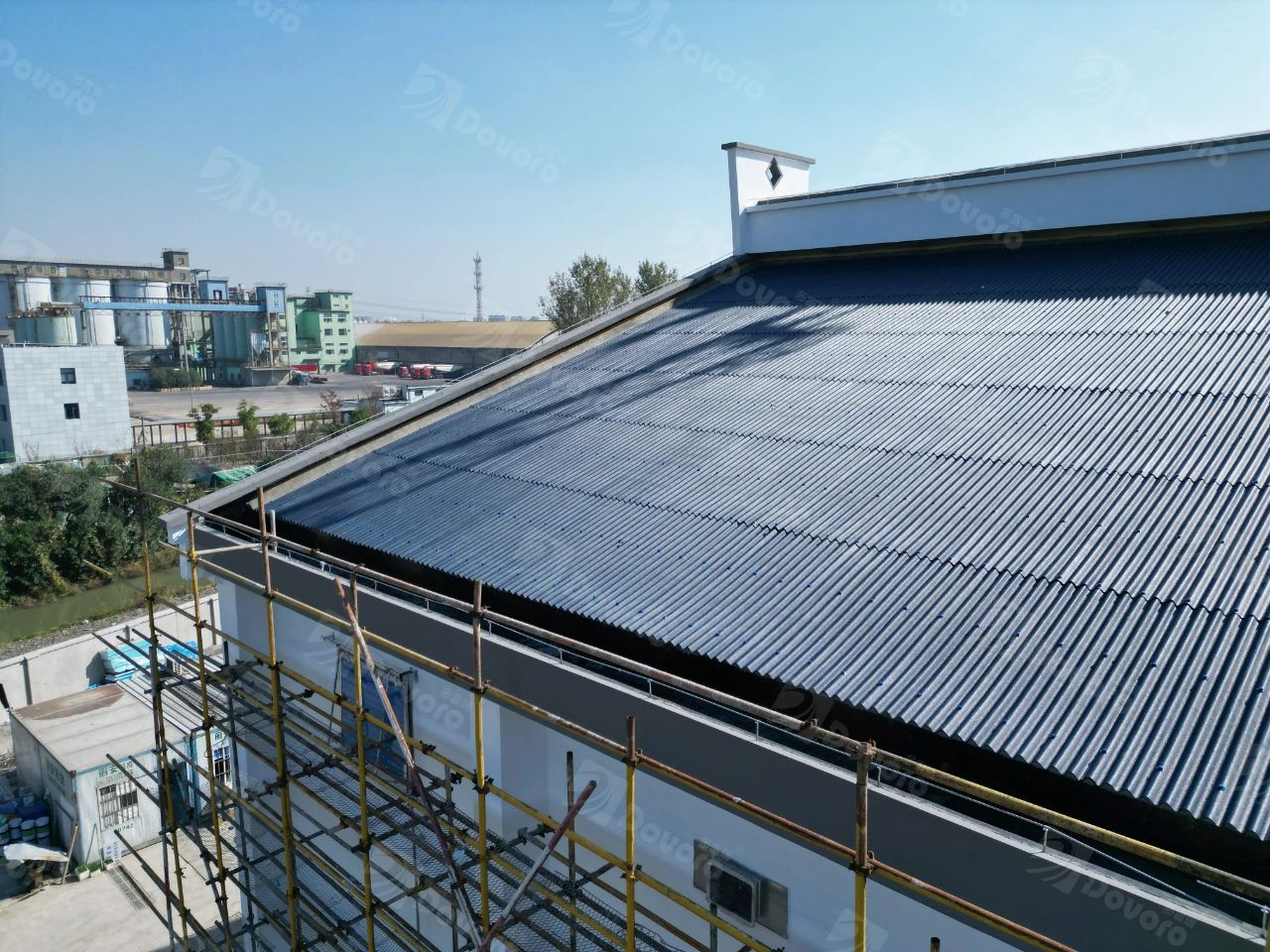 上海寶山國家儲(chǔ)備糧庫總規(guī)劃建設(shè)用地42畝,屬于超過一定規(guī)模、危險(xiǎn)性較大的分部分項(xiàng)工程,如何把控安全和質(zhì)量是項(xiàng)目管理的重點(diǎn)。波形瀝青瓦采用優(yōu)質(zhì)單層厚質(zhì)植物纖維與礦物元素,在高溫高壓下浸漬瀝青,重量僅有3kg/㎡,比水泥瓦、陶瓦更輕,不僅便于在鋼結(jié)構(gòu)坡屋面上施工,同時(shí)降低對屋面承重結(jié)構(gòu)的壓力,提高了施工安全,讓工程更有效率地順利進(jìn)行。