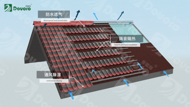 波形瀝青瓦具有防水、透氣、隔熱和除濕的作用,瓦材與基層間的空氣流通層,可以讓屋面系統(tǒng)內(nèi)部空氣與外界交換,使得屋面系統(tǒng)內(nèi)部保持干燥,同時隔絕外部熱量,延緩室內(nèi)溫度變化,節(jié)省能耗。