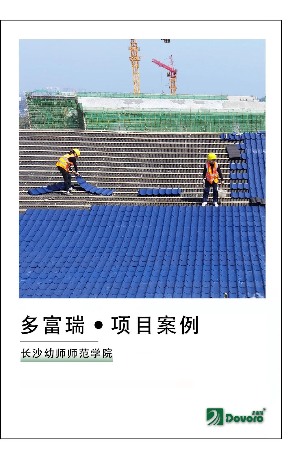 本項目為長沙幼師高等??茖W院,使用“幻彩”波形瀝青瓦和波形瀝青防水板組合施工,總施工面積約40000平米。