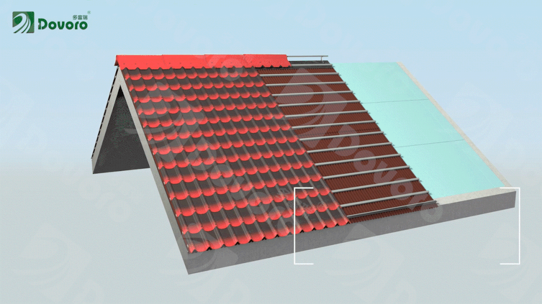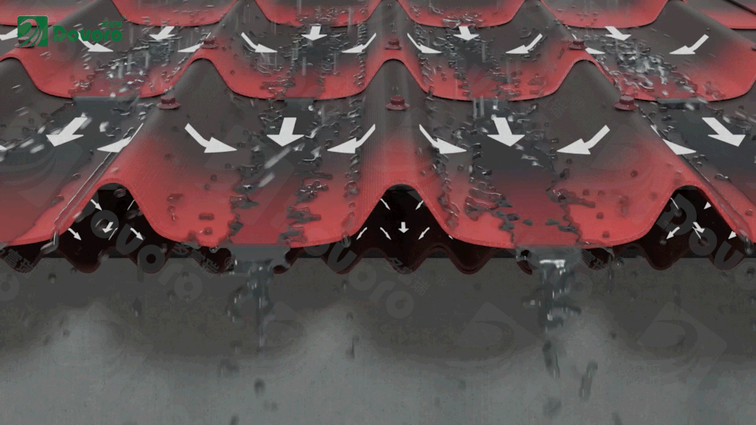 波形瀝青防水板采用了與波形瀝青瓦同樣的防排結(jié)合設(shè)計。遇到極端降雨天氣,一旦屋面瓦材發(fā)生滲漏,雨水也會順著波形瀝青防水板從上往下排出屋面,將屋面漏水的概率降至最低。