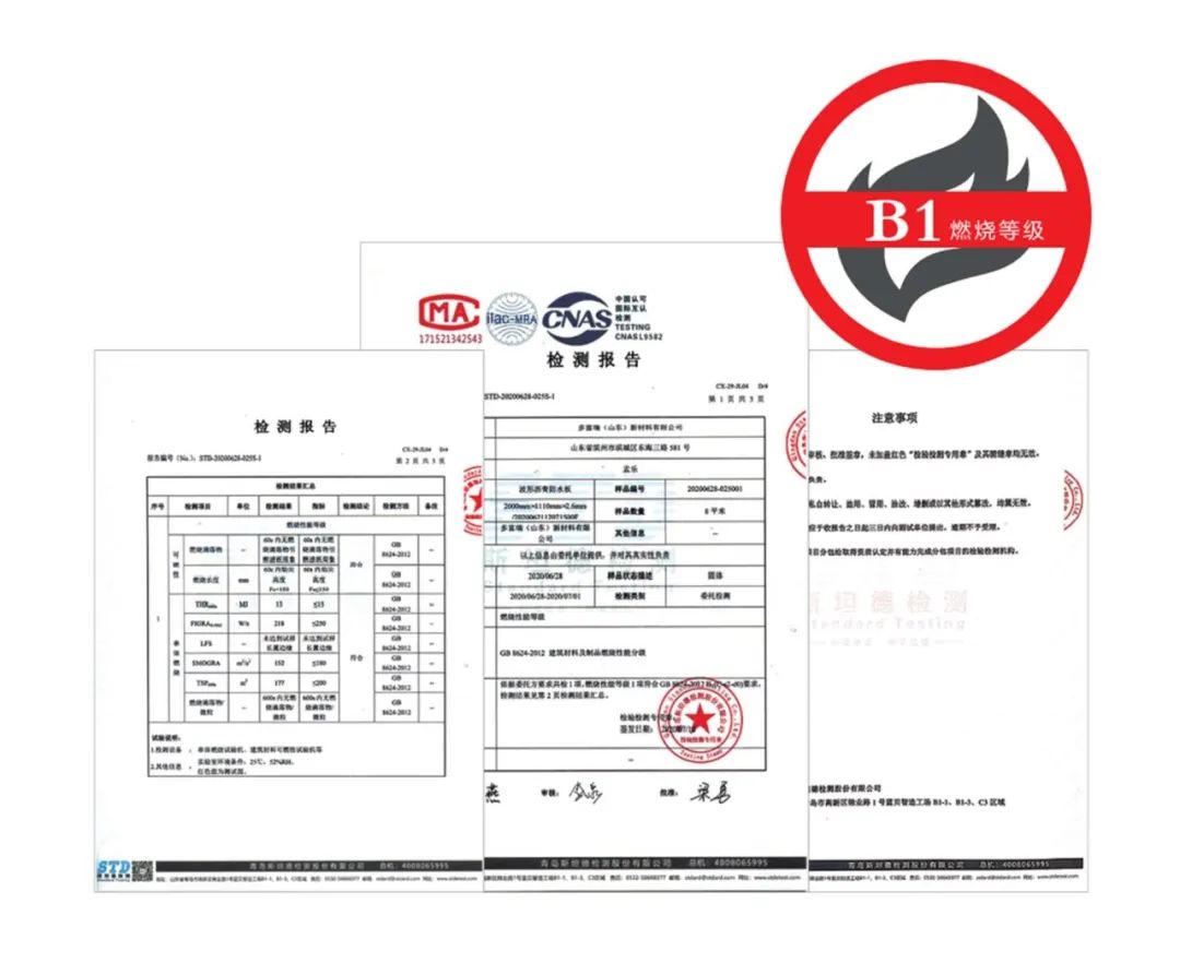 多富瑞2.0系列產(chǎn)品,包括波形瀝青瓦和波形瀝青防水板均符合最新的《建筑材料及制品燃燒性能分析》(GB8624-2012)B1級(jí)防火標(biāo)準(zhǔn)。