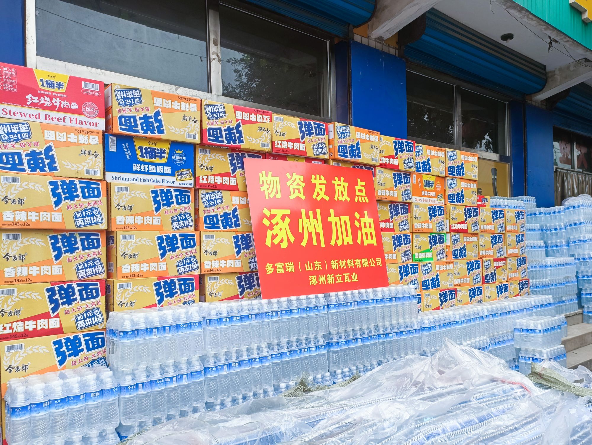 在了解到涿州搶險(xiǎn)救災(zāi)的緊迫和物資短缺的情況后,多富瑞立即展開馳援涿州的準(zhǔn)備工作,抽調(diào)人員,成立支援小組,緊急采購物資。8月6日清晨,兩輛滿載應(yīng)急食品、飲用水、生活用品的車輛,由多富瑞董事長趙民先生親自帶隊(duì),從山東濱州多富瑞生產(chǎn)基地駛出,直赴災(zāi)區(qū)。