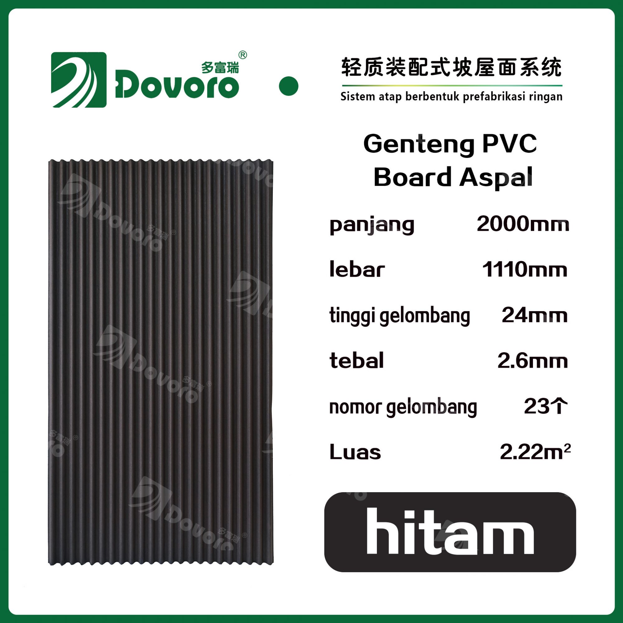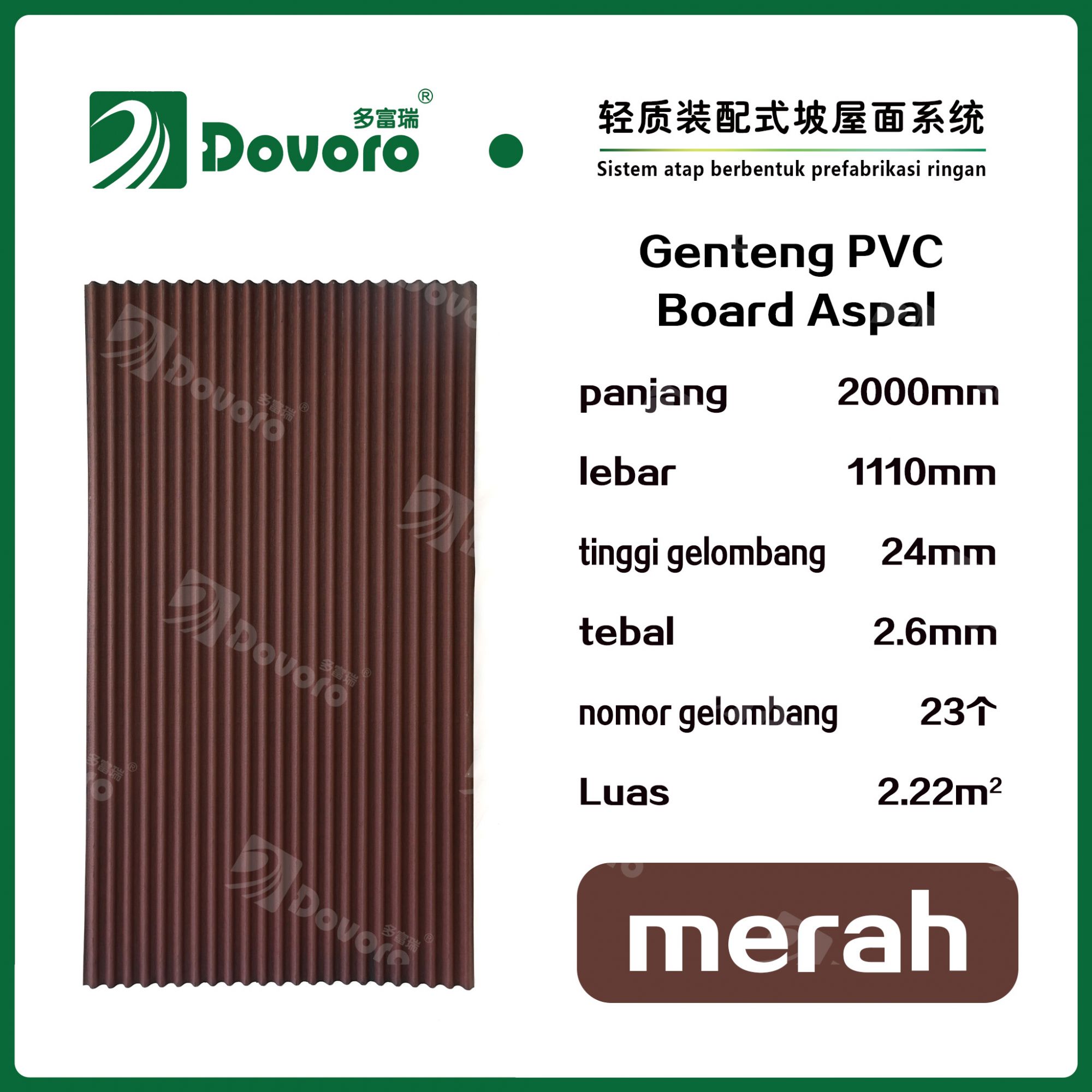 Sebagai lapisan dasar dari berbagai jenis material genteng, Genteng PVC Board Aspal Dovoro sangat baik dalam fungsi anti-air, anti-pengap, isolasi termal, dan pengurangan kelembaban. Sehingga memudahkan kerja sama dengan Material isolasi lainnya dan genteng atap, yang tidak hanya mengurangi biaya total proyek atap, tetapi juga membuat pemasangan menjadi lebih sederhana, sehingga kualitas proyek atap terjamin.