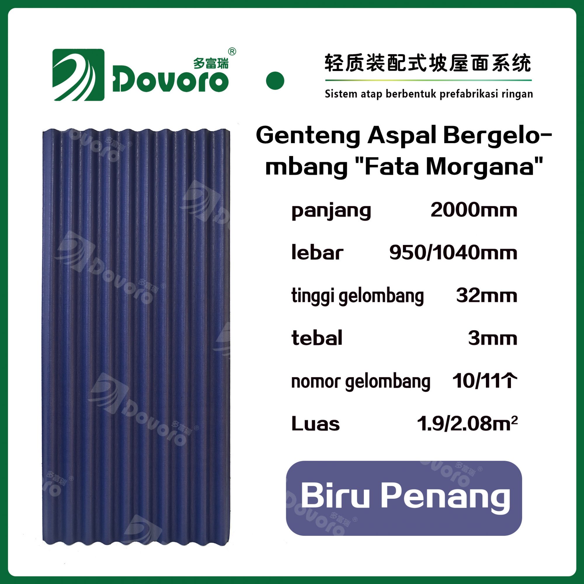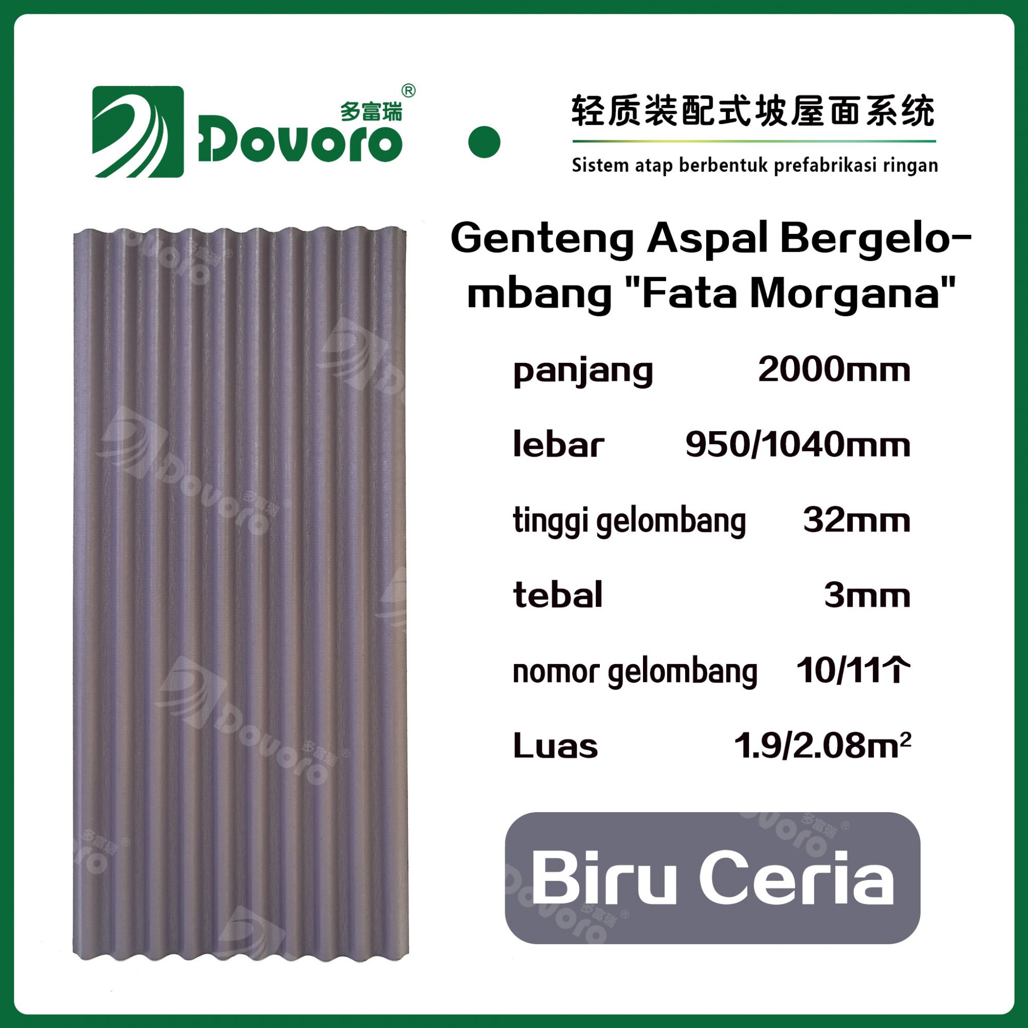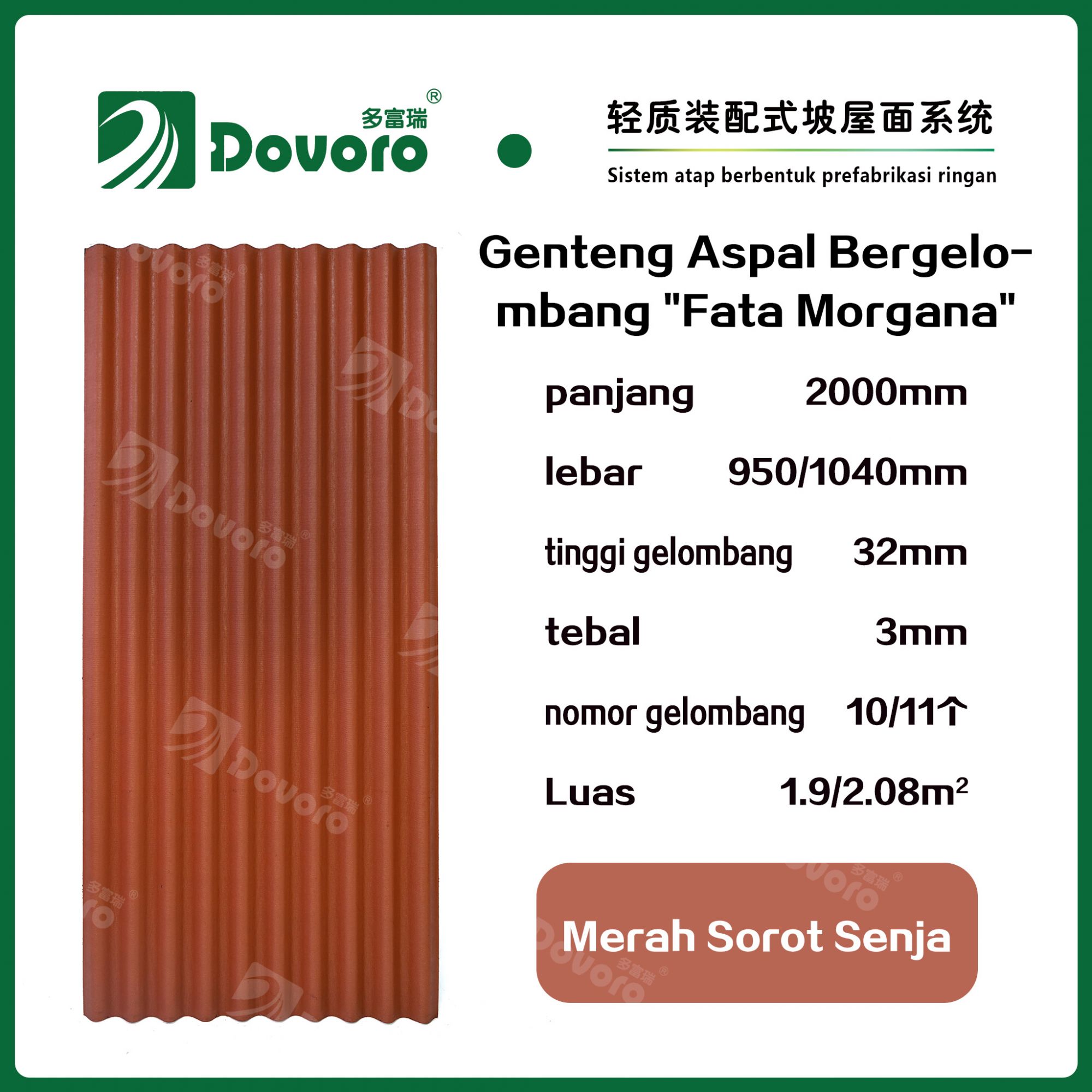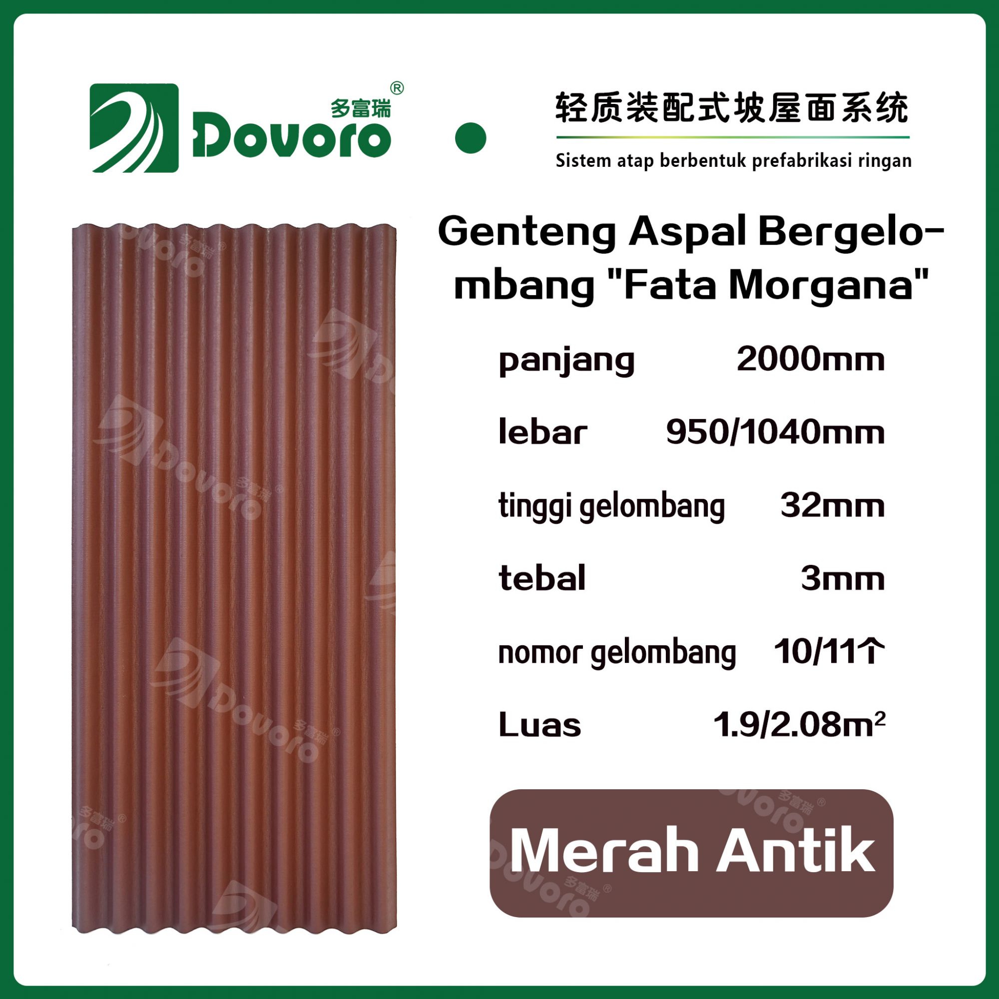 1、Genteng aspal bergelombang “Fata Morgana” Dovoro dibuat dengan cara merendam serat mineral dalam aspal pada suhu dan tekanan tinggi, sehingga material genteng menjadi lebih kokoh dan memiliki ketangguhan yang tinggi. Resin tahan panas digunakan untuk mempertahankan kekokohan genteng;