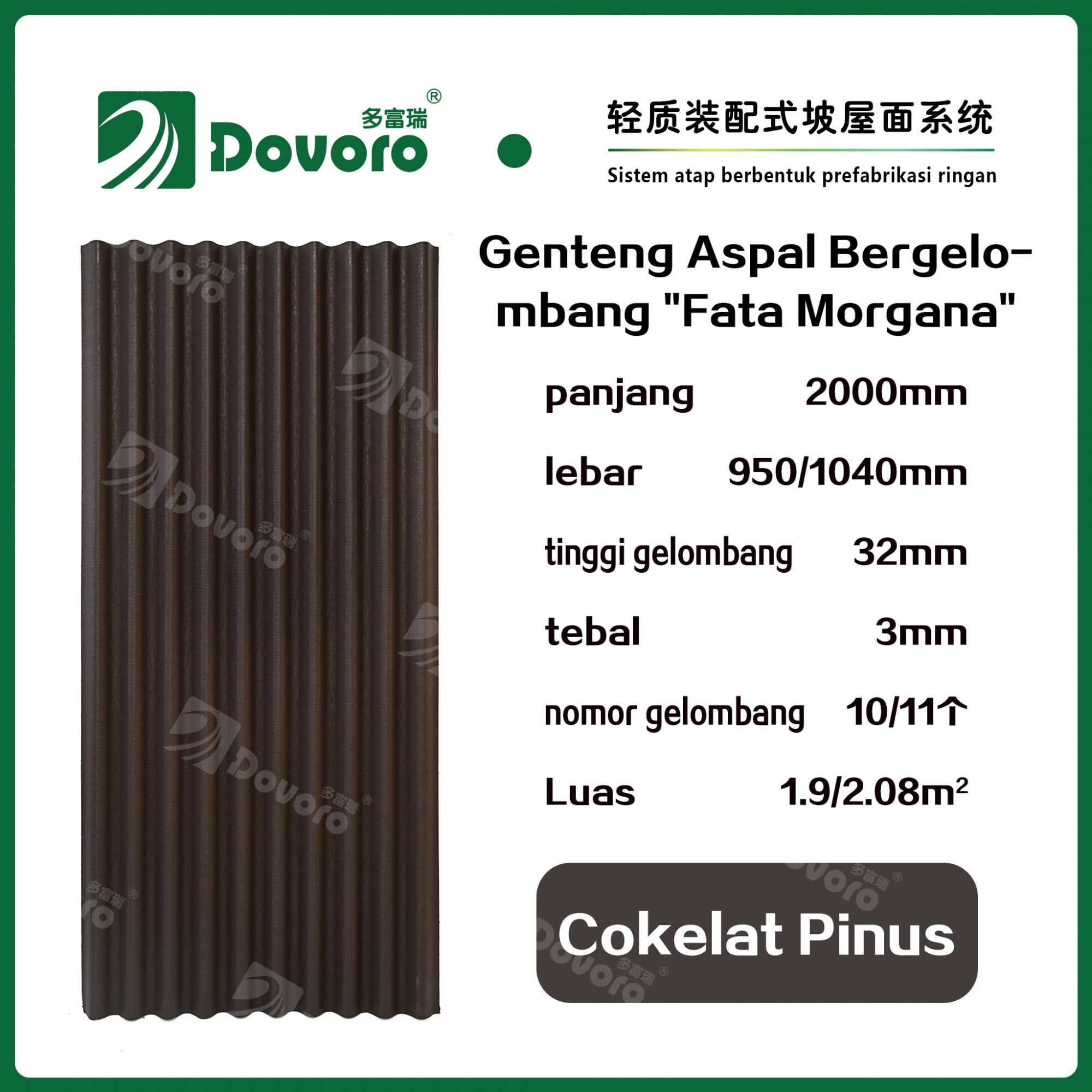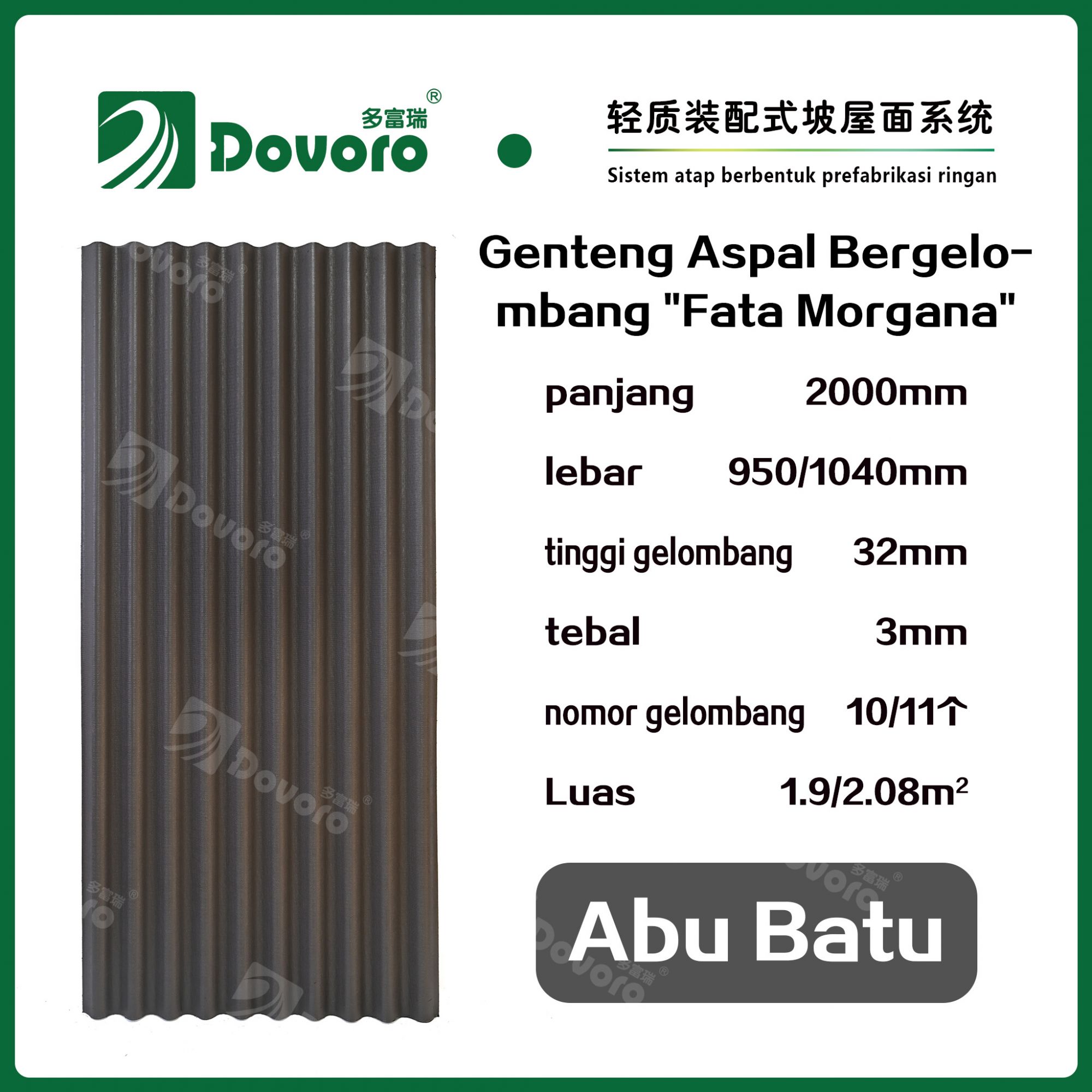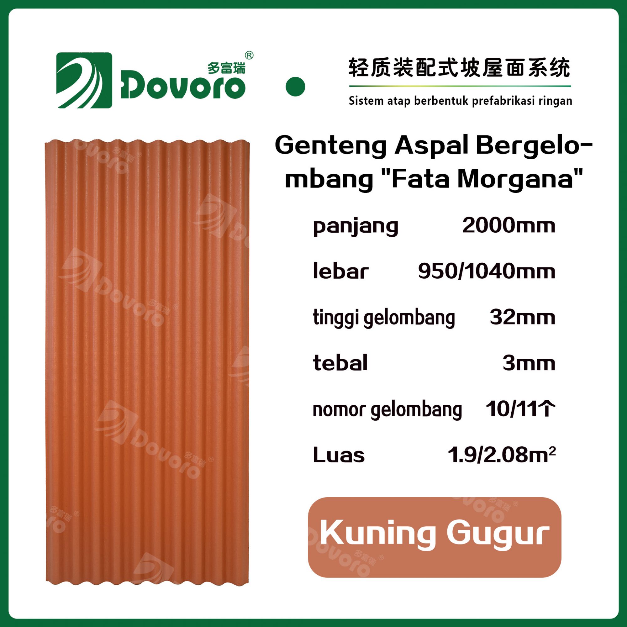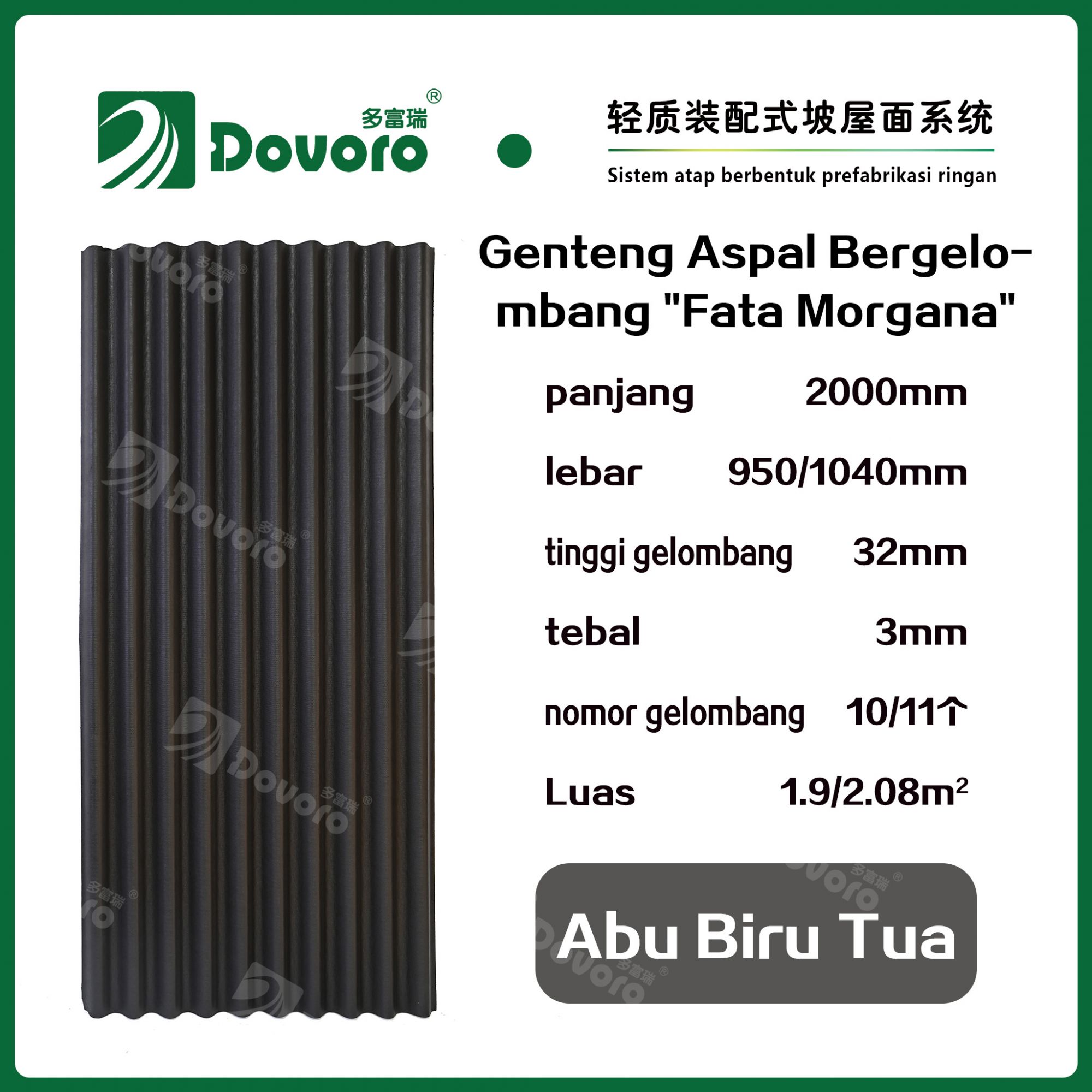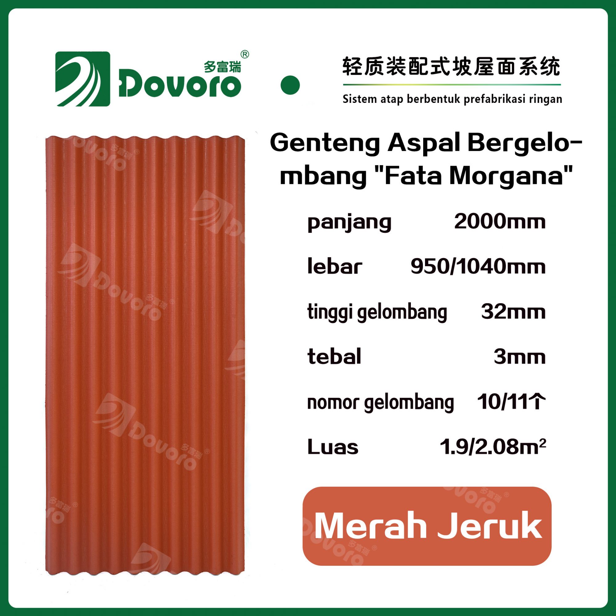 1、Genteng aspal bergelombang “Fata Morgana” Dovoro dibuat dengan cara merendam serat mineral dalam aspal pada suhu dan tekanan tinggi, sehingga material genteng menjadi lebih kokoh dan memiliki ketangguhan yang tinggi. Resin tahan panas digunakan untuk mempertahankan kekokohan genteng;
